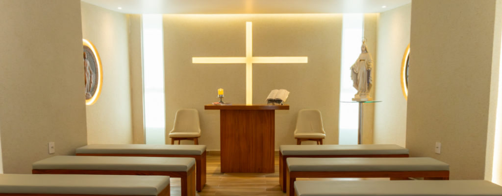 A capela é um espaço de oração e reflexão, aberto a todos que buscam conforto espiritual. Um ambiente de paz, fé e acolhimento, dedicado à Nossa Senhora das Graças.